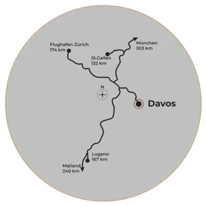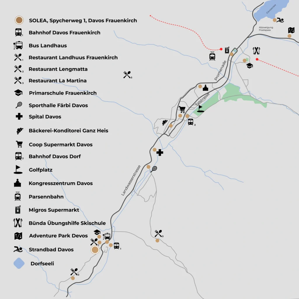 Der Bahnhof Davos Frauenkirch sowie die nahegelegene Bushaltestelle Landhaus sind fussläufig erreichbar. Von hier gelangen Sie bequem nach Davos Platz oder in Richtung Filisur – ideal für den Alltag wie auch für Wochenendgäste.