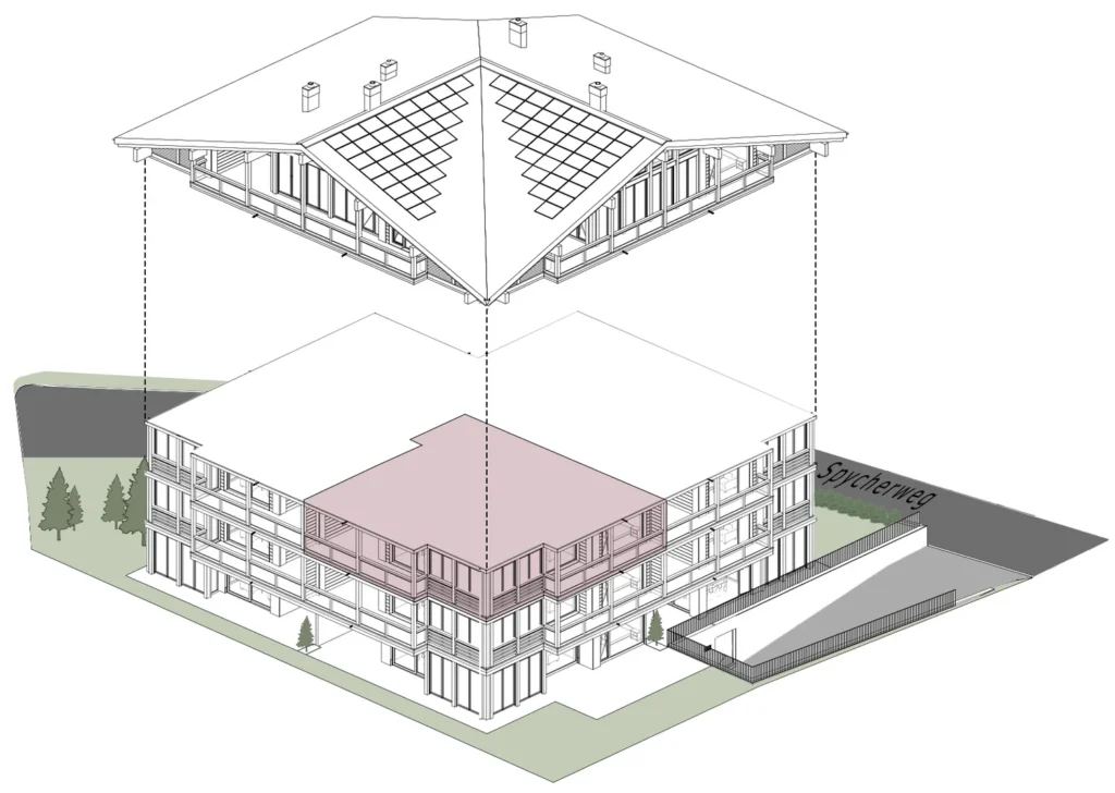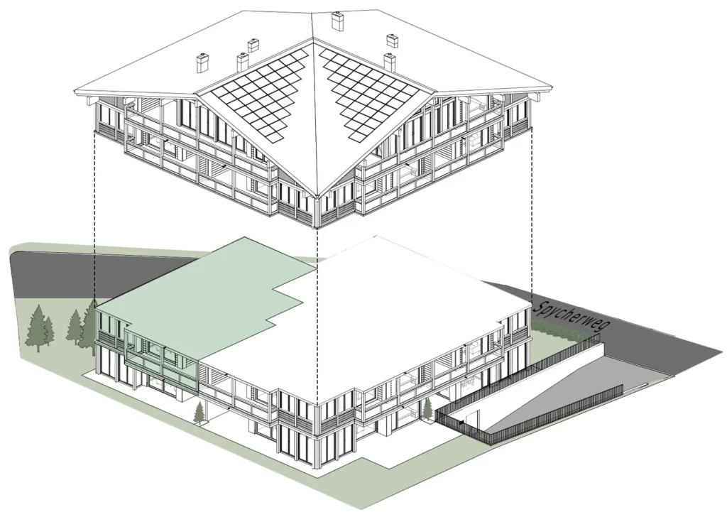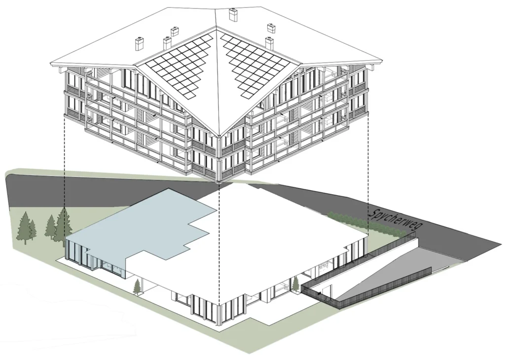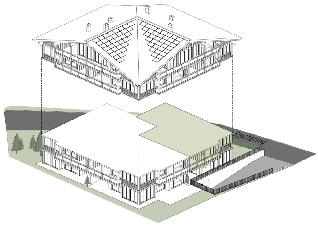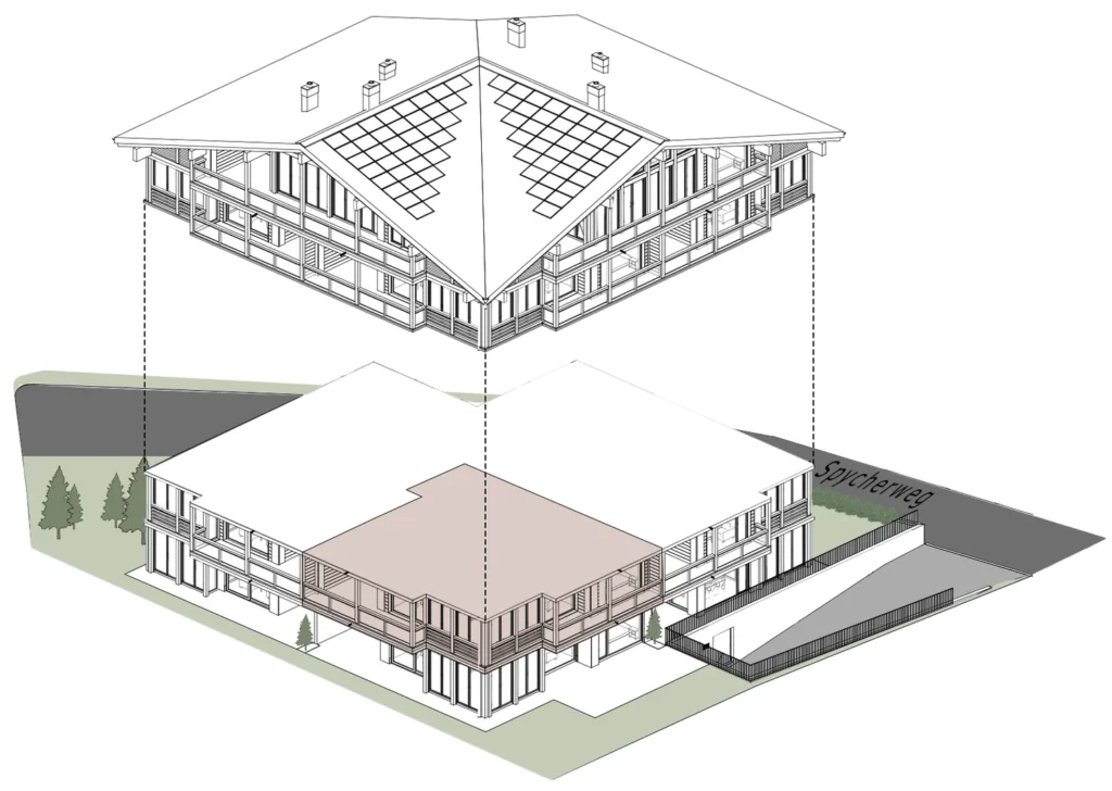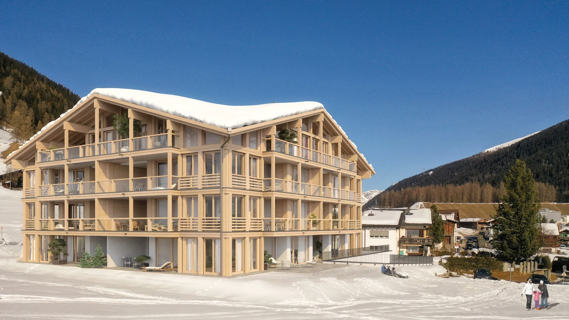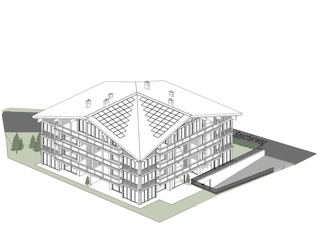In der weiten Landschaft von Davos Frauenkirch entsteht mit SOLEA ein neues Zuhause für Menschen, die Naturverbundenheit, Klarheit und eine stilvolle Umsetzung schätzen. Die Fassade ist in sägeroher Fichte ausgeführt, das Dach in sichtbarer Holzkonstruktion mit Sparren und Balken aus Fichte für einen alpinen Charakter.