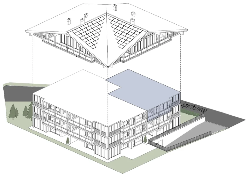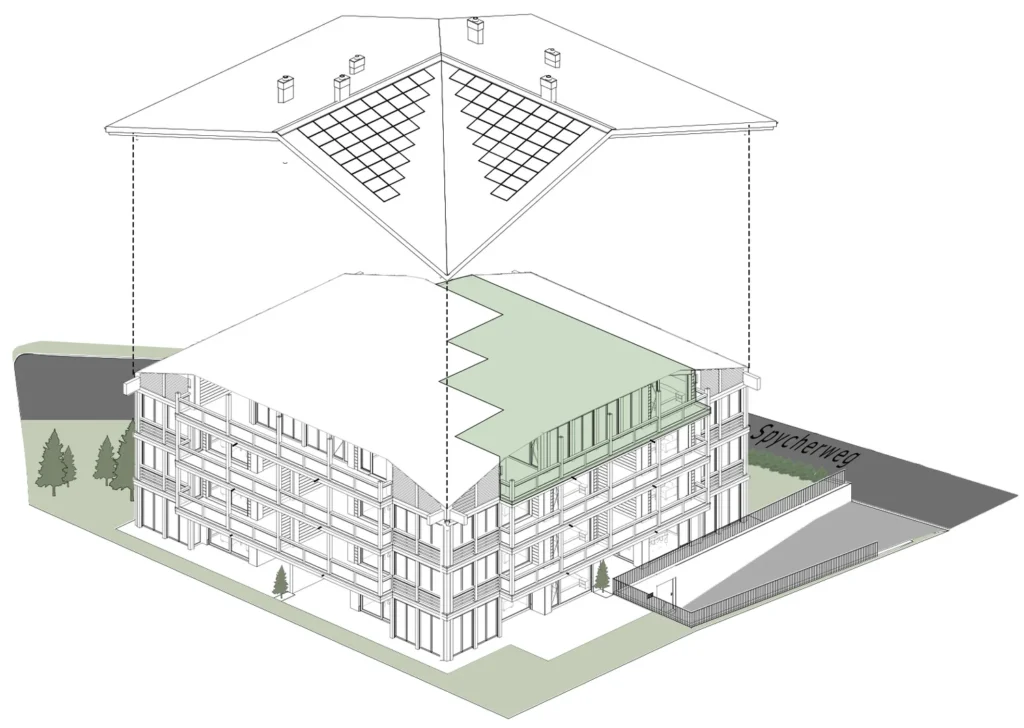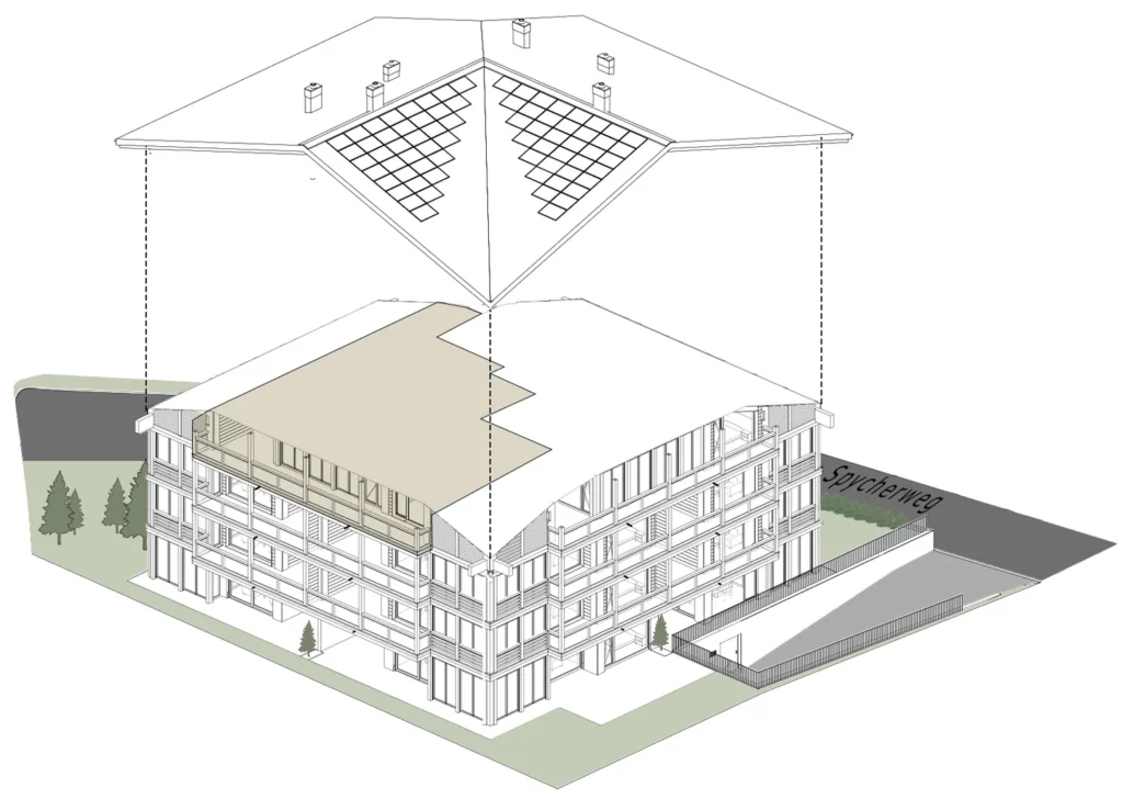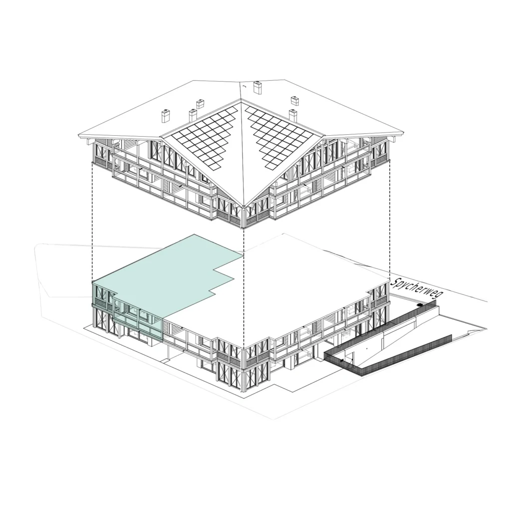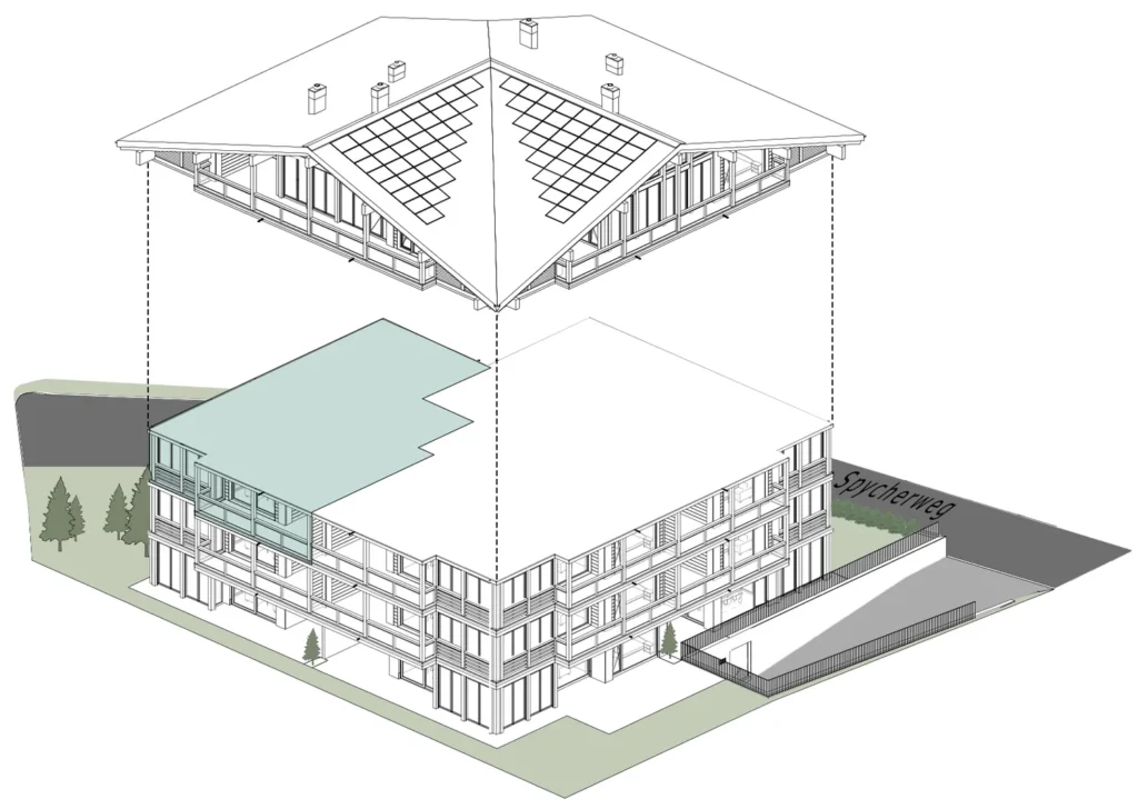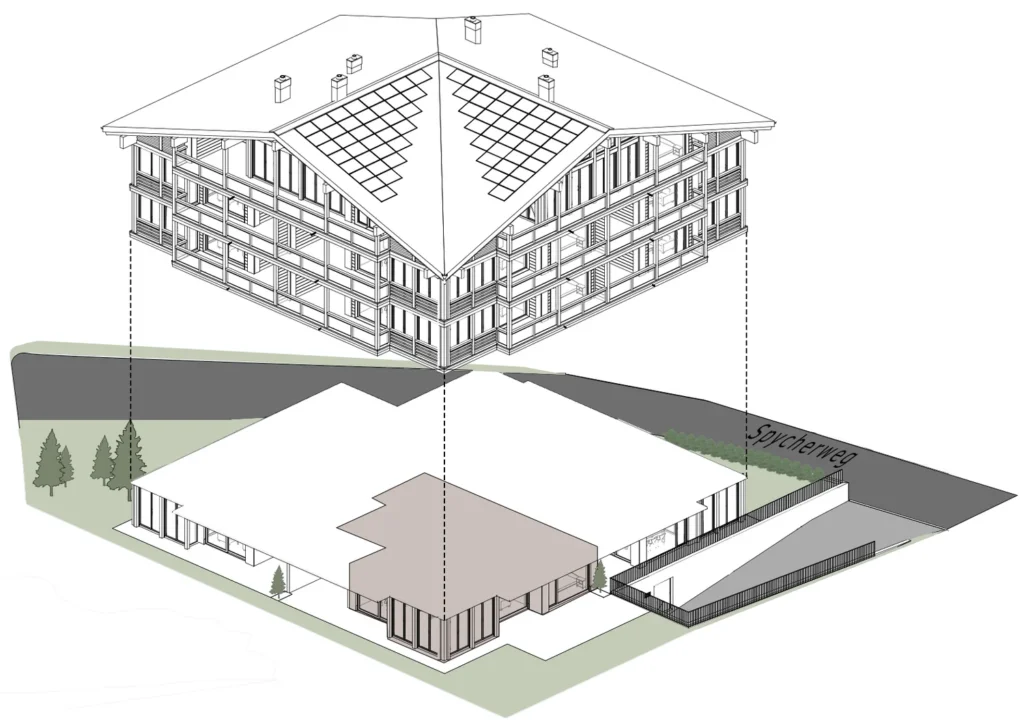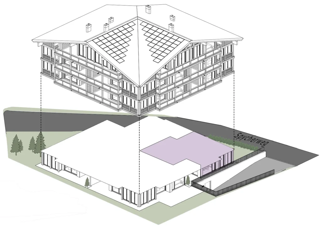 In der weiten Landschaft von Davos Frauenkirch entsteht mit SOLEA ein neues Zuhause für Menschen, die Naturverbundenheit, Klarheit und eine stilvolle Umsetzung schätzen. Die Fassade ist in sägeroher Fichte ausgeführt, das Dach in sichtbarer Holzkonstruktion mit Sparren und Balken aus Fichte für einen alpinen Charakter.